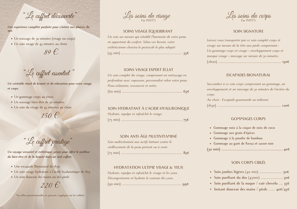 - Coffrets expériences : 3 coffrets à offrir ou se faire offrir - Soins du visage : Hydratation ultime visage & yeux / massage kobido en supplément de votre soin visage - Massage "Deep-tissue" 80 minutes                   |